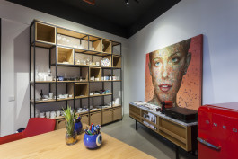 180 m2’lik, imalat ve yönetim kısmının iç içe olduğu ilk atölyeden sonra, 750 m2’lik ikinci atölyeyi dükkanlardan oluşan sokak konseptiyle düşündük. Giriş kapsının kutu profillerden oluşması, içerde yine kemerli profil pencereler, sıvasız ham briket bloklarla örülü duvarlar, kolon üstlerinde sokak lambaları, sıva üstü aydınlatma boruları ve beton zeminler… Tamamen ham ve yalın imalathane düşüncesiyle. Hatta girişte kullanılan grafitiyi de o sokak efektinin bir parçası olarak tasarladık…